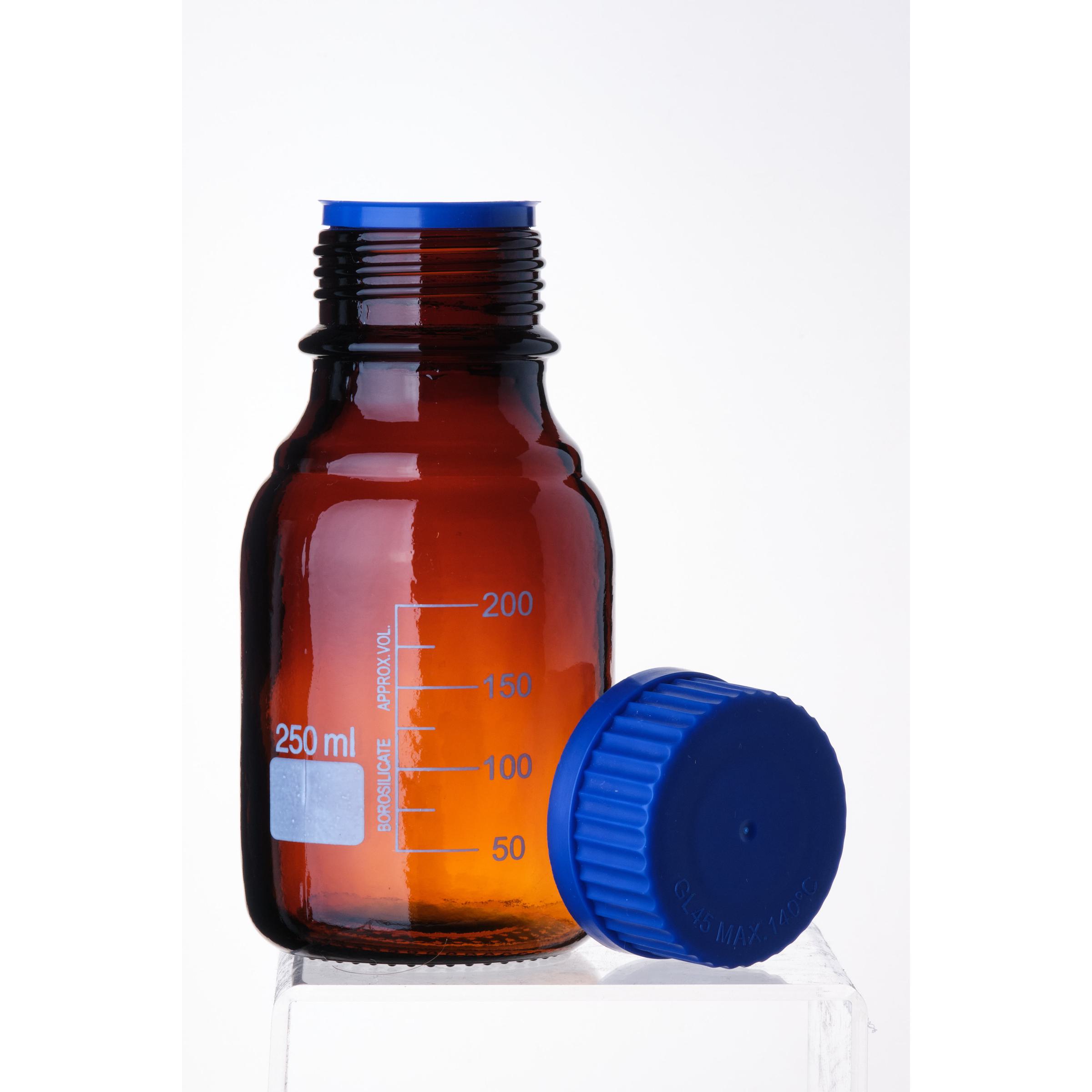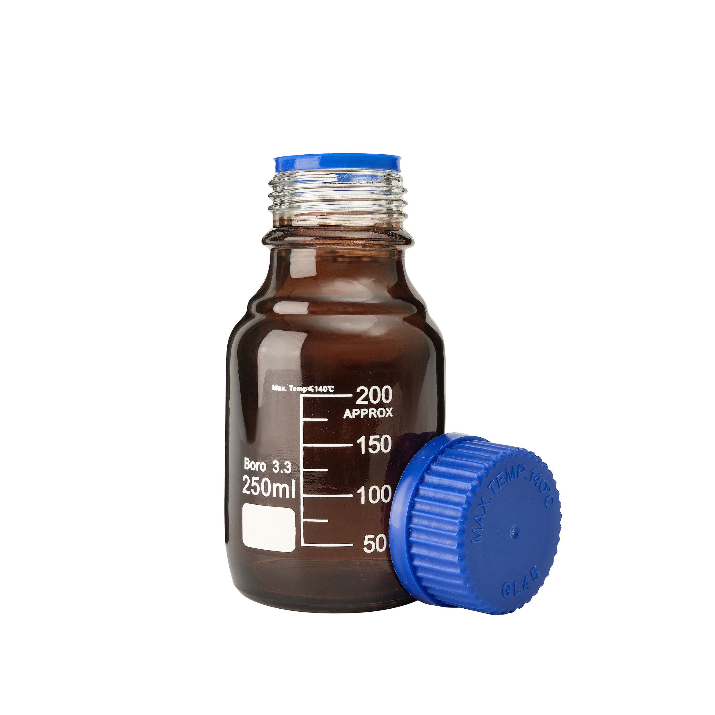 Банка лабораторная, 250 мл, темное боросиликатное стекло с узким горлом, шкалой и крышкой - предназначена для хранения химических реактивов.