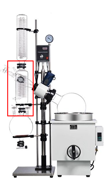 Холодильник А2 устанавливается между пароотводной трубкой и приемной колбой 50-литрового роторного испарителя. Он обеспечивает полную конденсацию паров растворителя, образующихся при вращении испарительной колбы в нагретой бане, предотвращая попадание паров в вакуумный насос и позволяя собирать дистиллят в приемную колбу.