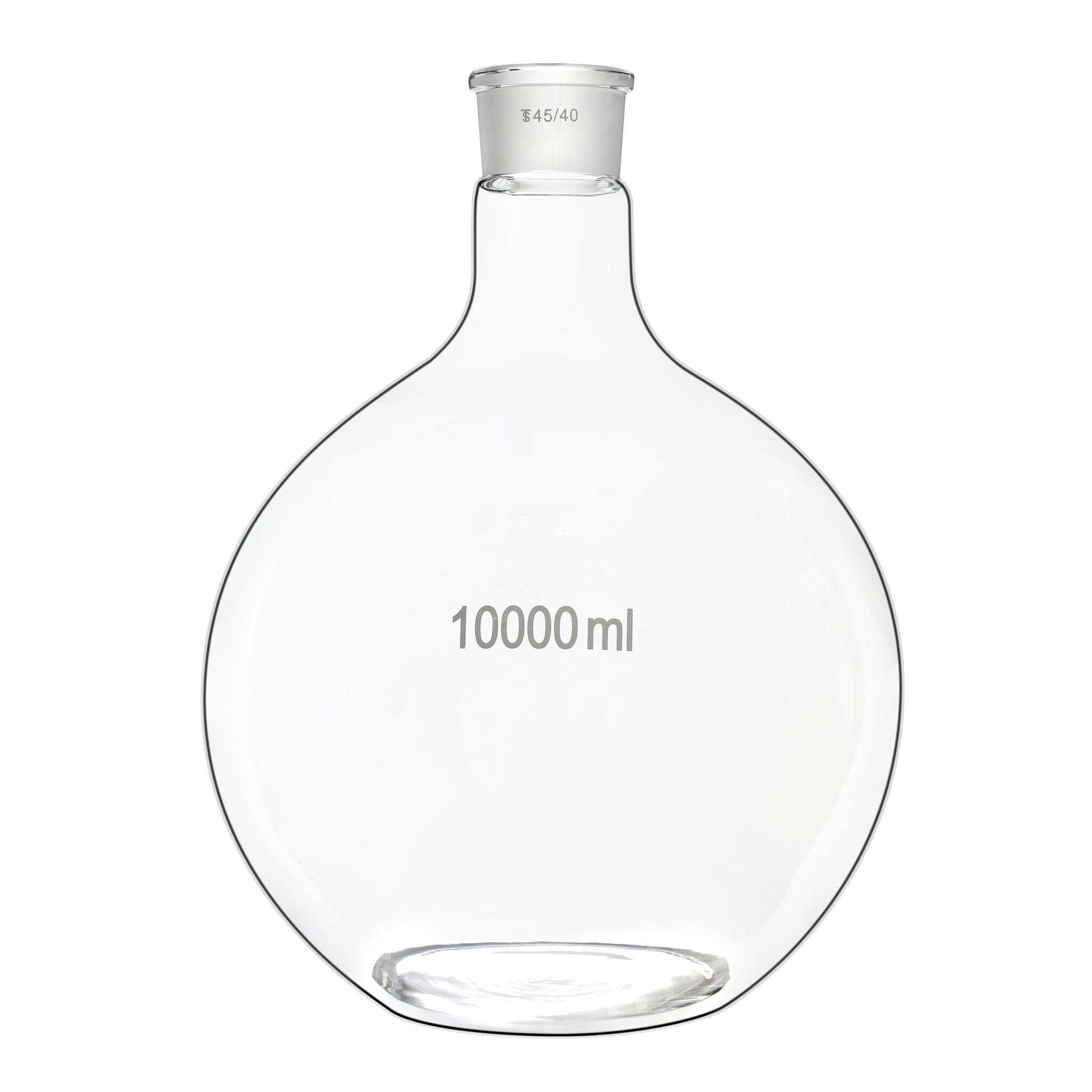 Колба плоскодонная, 10000 мл, шлиф 45/40 - изготовлена из термостойкого стекла и отлично подходит для различных химических экспериментов. Стекло химически-нейтрально и может выдержать не только жар, но и воздействия самого широкого спектра веществ.