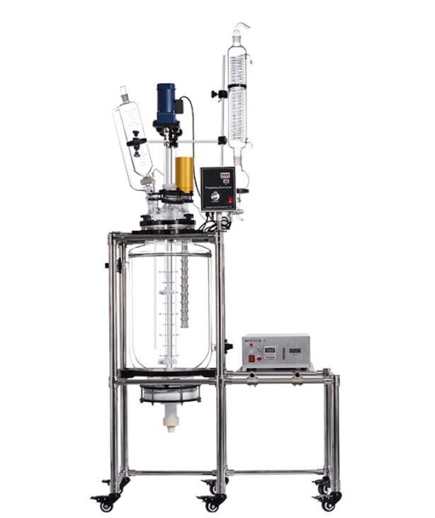 Реактор стеклянный лабораторный химический S212-100L с рубашкой, 100л используется в лабораториях и небольших производствах для дистилляции, нагревания или размешивания различных веществ. В том числе при пониженном давлении.