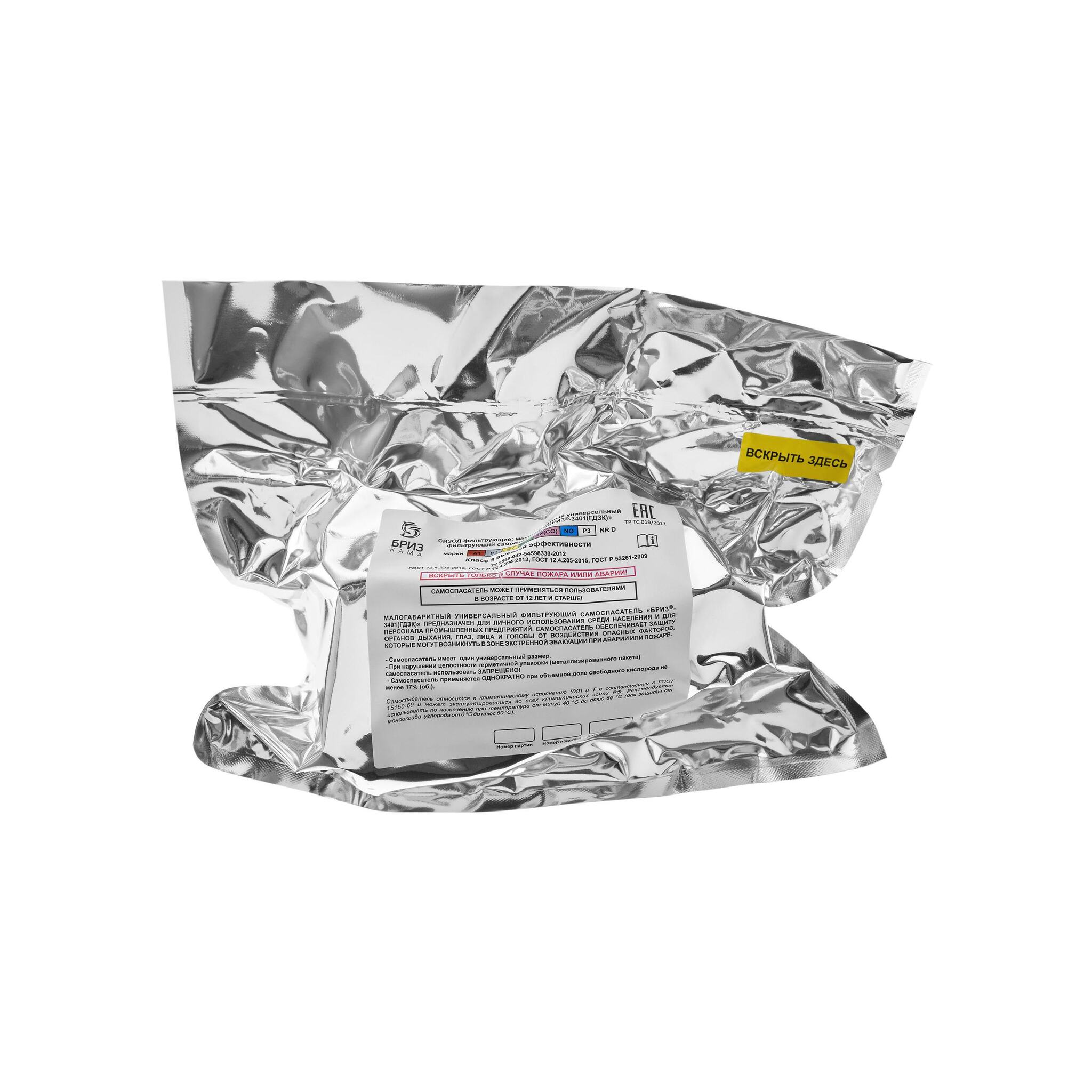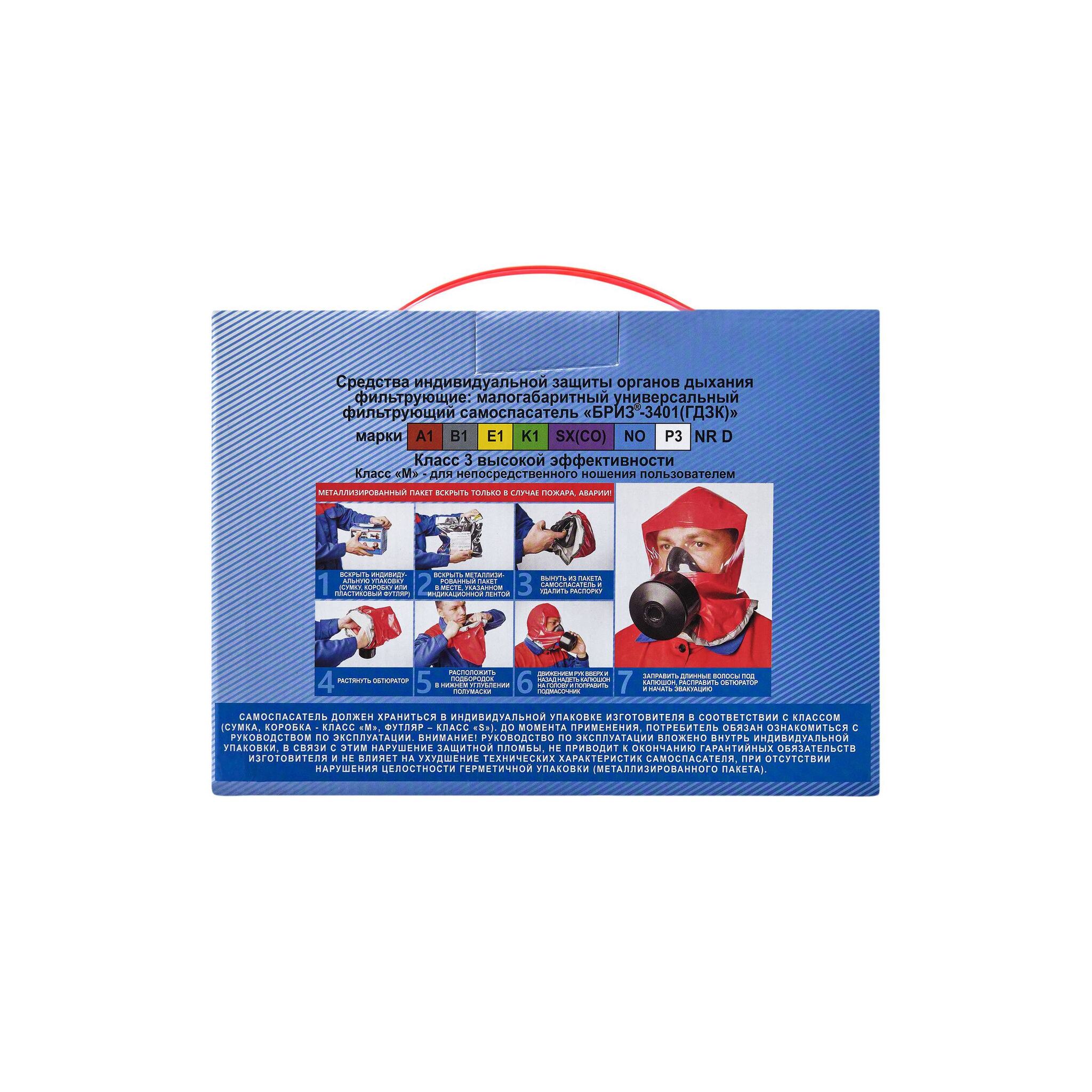Средства индивидуальной защиты органов дыхания фильтрующее. Малогабаритный универсальный фильтрующий самоспасатель "БРИЗ®-3401(ГДЗК)" предназначен для личного использования среди населения (в том числе и детей в возрасте от 12 лет) и для персонала промышленных предприятий. Самоспасатель обеспечивает защиту органов дыхания, глаз, лица и головы от воздействия опасных факторов, которые могут возникнуть в зоне экстренной эвакуации при аварии или пожаре. Обеспечивает защиту от токсичных продуктов горения, в том числе от монооксида углерода, газов и паров химически опасных веществ, а также аэрозолей различного вида (пыль, дым, туман). Рекомендуется использовать по назначению при температуре от минус 40°С до плюс 60°С (для защиты от монооксида углерода от 0°С до плюс 60°С). Самоспасатель "БРИЗ®-3401(ГДЗК)" соответствует ГОСТ Р 53261-2009, ГОСТ Р 12.4.294-2013, ГОСТ 12.4.285-2015, ГОСТ 12.4.235-2019, которые обеспечивают соблюдение требований ТР ТС 019/2011.