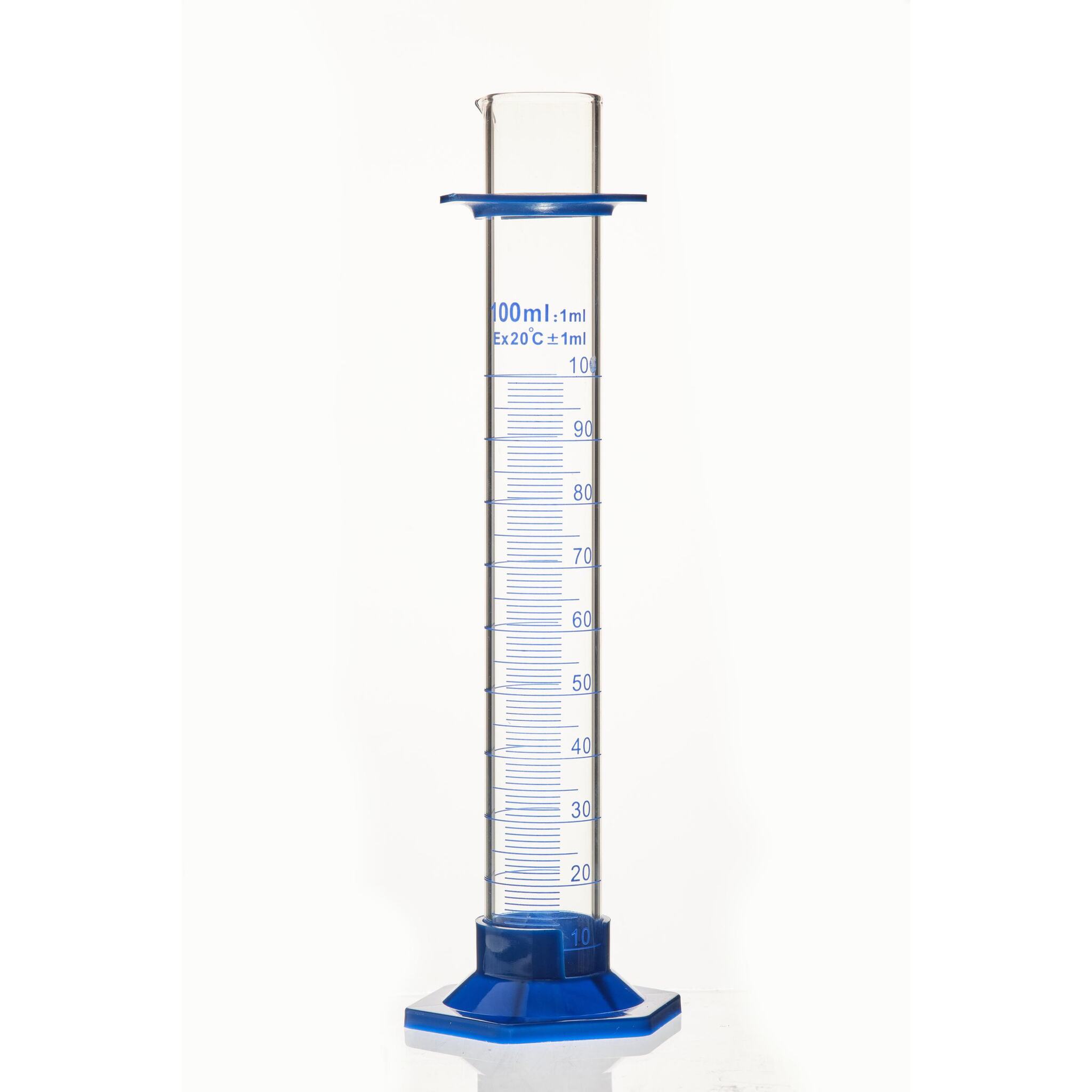 Цилиндр мерный стеклянный с носиком, 100 мл, на шестигранном пластиковом основании - предназначен для отмеривания жидкостей методом налива.