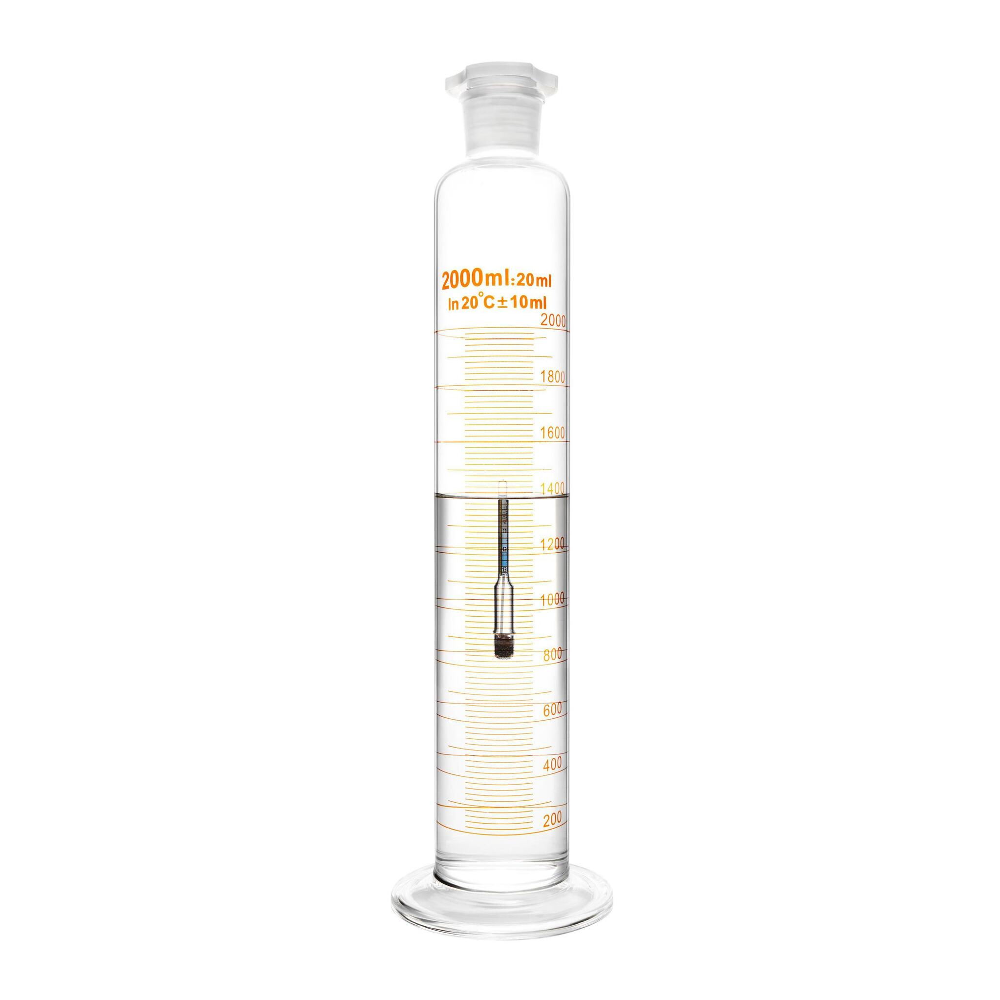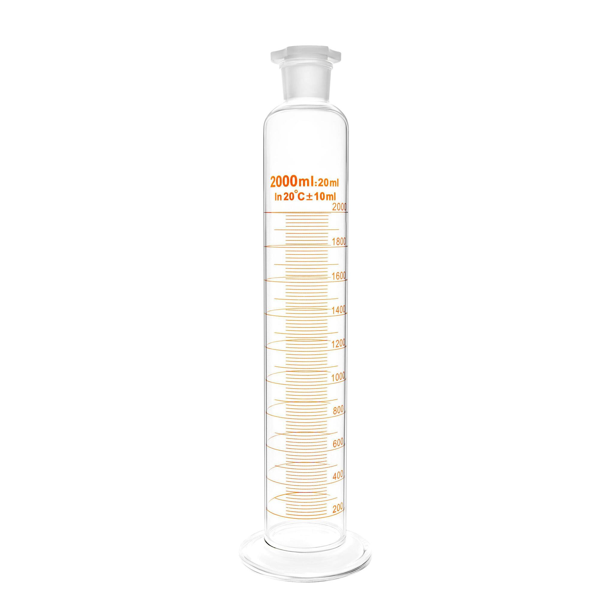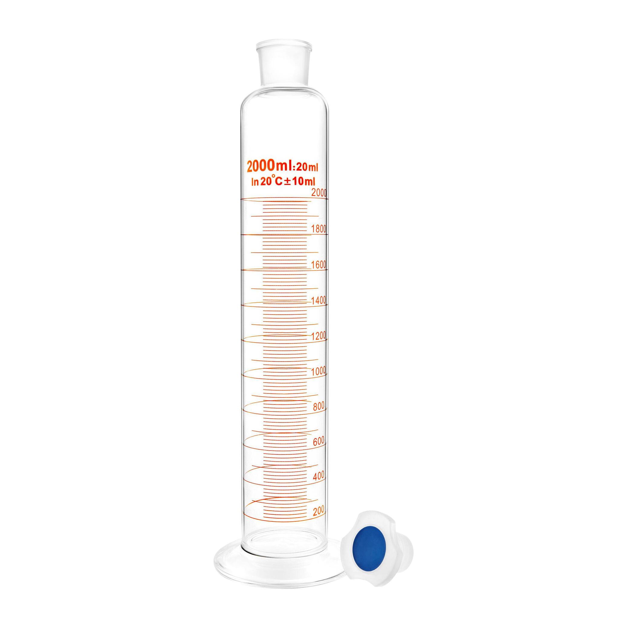 Цилиндр мерный стеклянный с пластиковой пробкой, 2000 мл, с круглым стеклянным основанием - предназначен для отмеривания жидкостей методом налива.