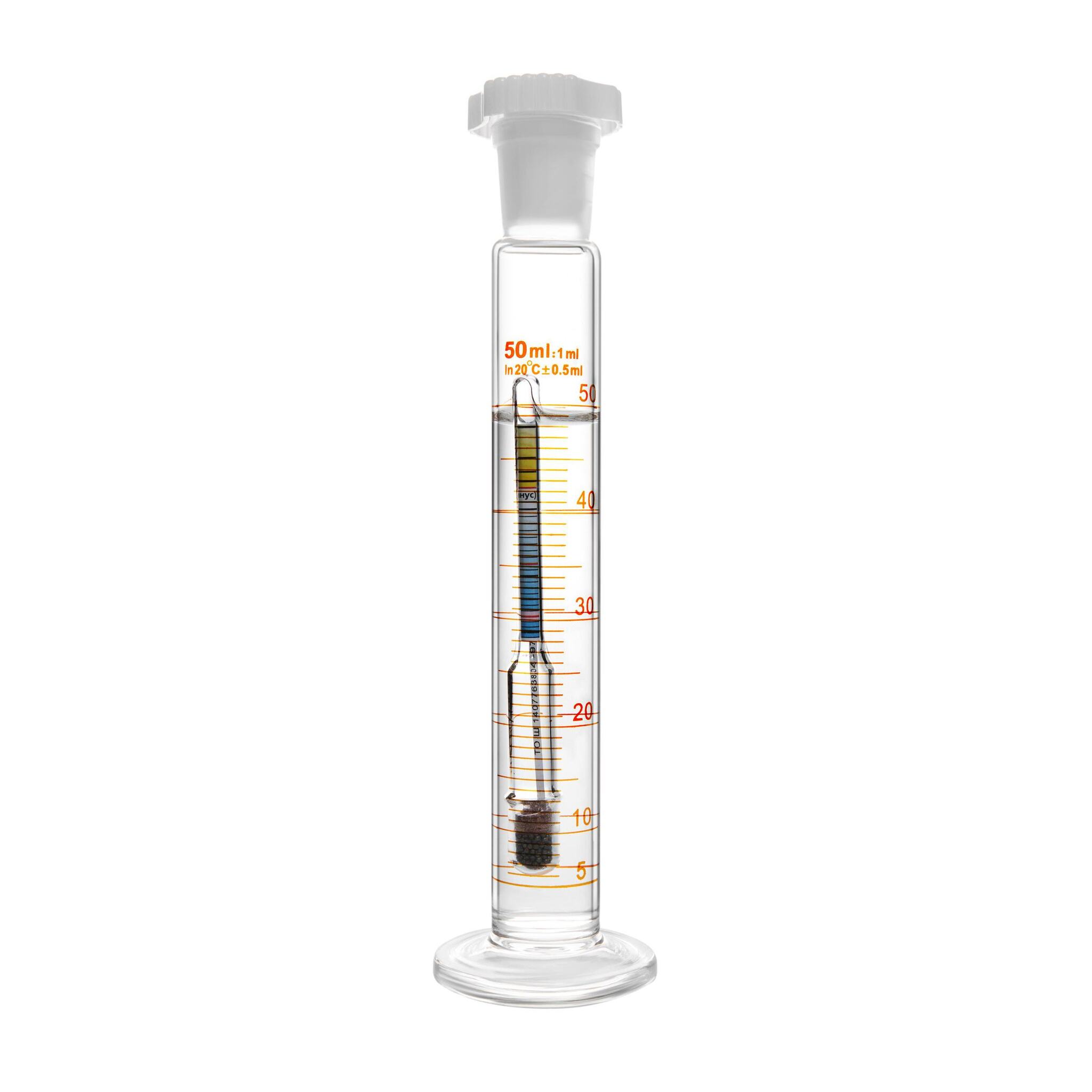 Цилиндр мерный стеклянный с пластиковой пробкой, 50 мл, с круглым стеклянным основанием - предназначен для отмеривания жидкостей методом налива.