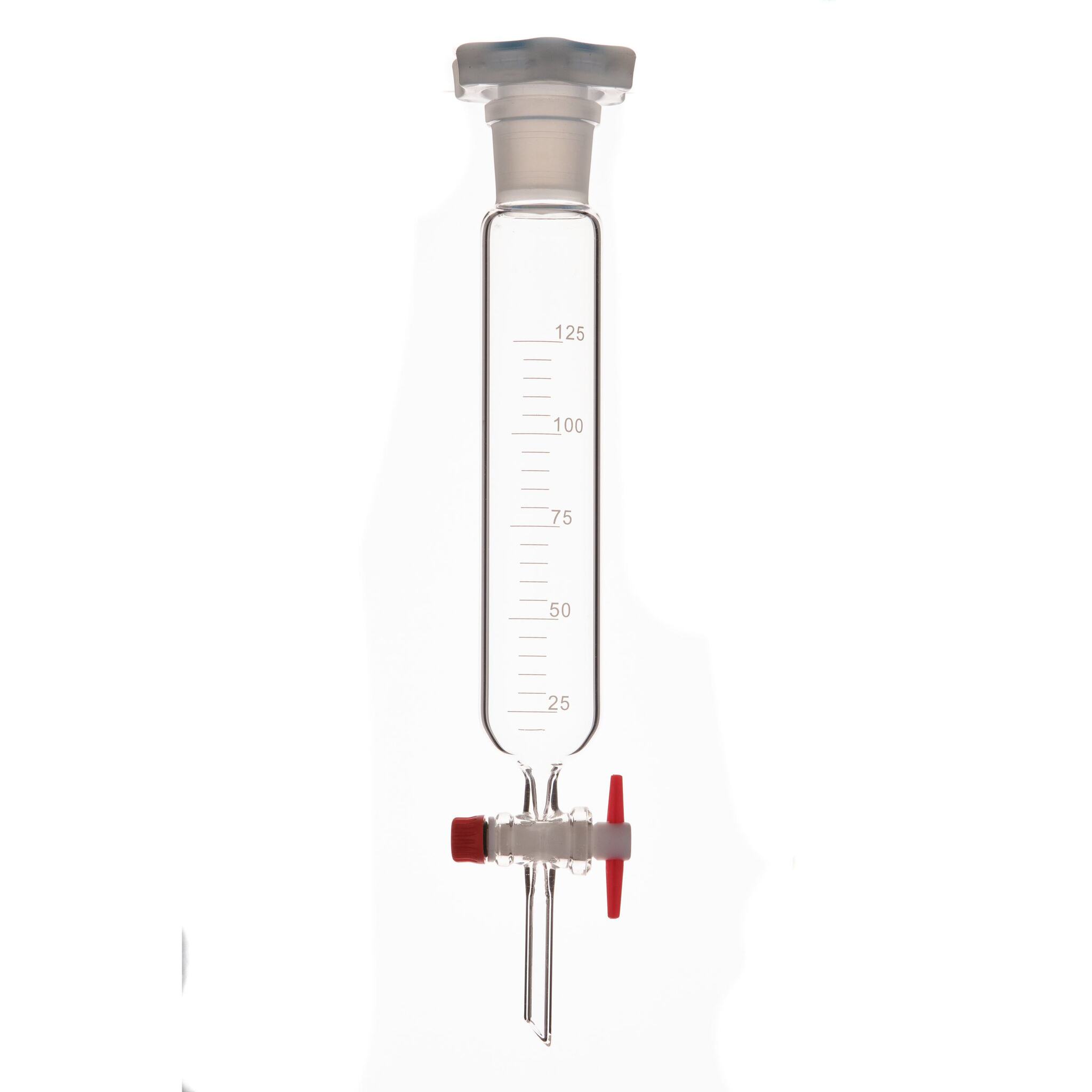 Воронка делительная цилиндрическая, 125 мл, шлиф 29/32, с PTFE краном и пробкой — это прецизионный инструмент для разделения несмешивающихся жидкостей, часто используемый в лабораторных процедурах экстрагирования. Метка емкости на стенке воронки позволяет точно измерять объем.